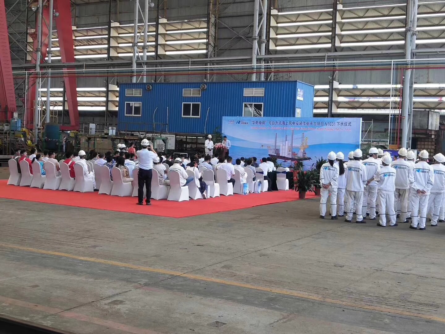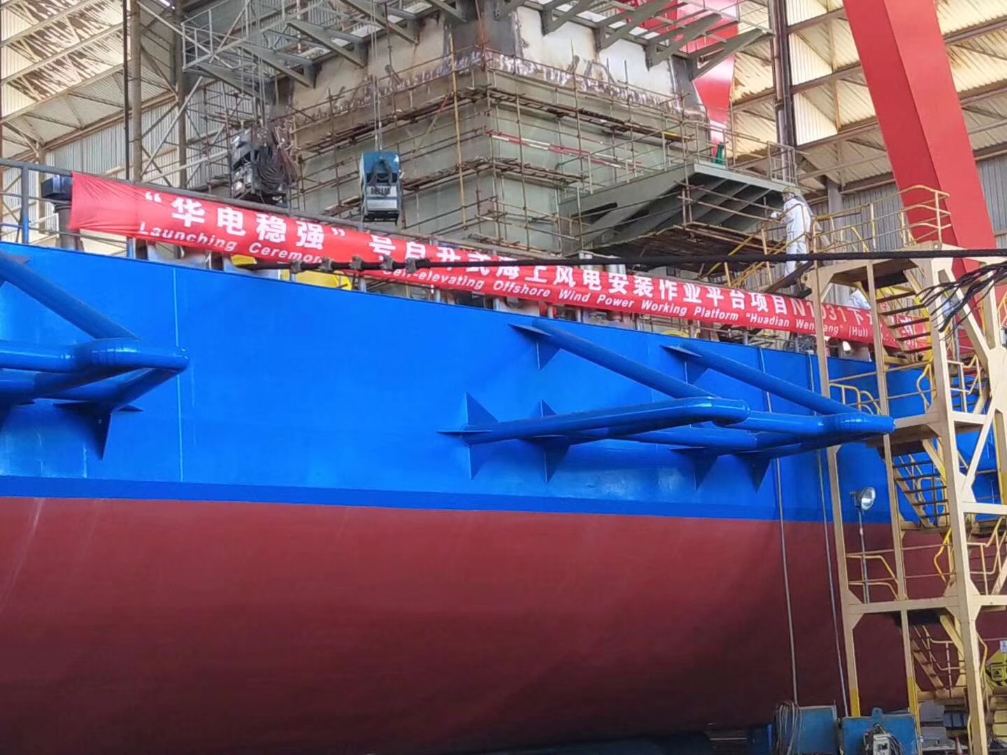 熱烈祝賀由南通豪通船務(wù)在潤邦海洋總包主船體搭載工程的“華電穩(wěn)強”號自升式海上風電安裝作業(yè)平臺于2018年8月28日中午順利下水!